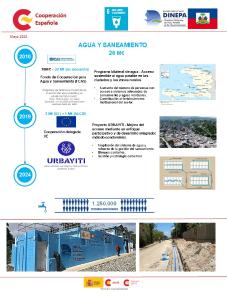 En Haití, España está a la cabeza de los donantes que han comprometido recursos para llevar el agua y el saneamiento a la población haitiana. Con una población de 11 millones de habitantes, tan solo el 64% de la población usa fuentes mejoradas de abastecimiento de agua potable, y se viene apreciando una disminución en la cobertura desde el año 2000 (67,8%). Por su lado, la disponibilidad de servicios de saneamiento es mínima en el país, ya que tan sólo uno de cada tres hogares urbanos está conectado a alguna red de saneamiento (34%), mientras que en áreas rurales estos no llegan a la quinta parte (17%).