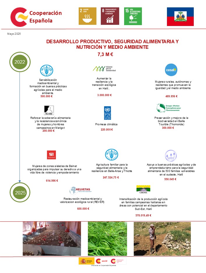 La AECID concentra sus intervenciones en el Departamento Sudeste de Haití donde, siguiendo las líneas prioritarias marcadas en el sector por el Ministerio de Agricultura, Recursos Naturales y Desarrollo Rural (MARNDR), financia proyectos de refuerzo del desarrollo rural, la agricultura y la seguridad alimentaria y nutricional. En 2021, junto con la FAO, se promovió una dinámica de coordinación regional denominada Alianza PROSAN, por medio de la cual se intenta potenciar las sinergias entre todos los actores del sector, asegurando la participación y el alineamiento de todos los socios de la cooperación española en la política agrícola departamental.