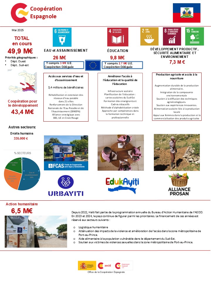 Haïti est répertorié comme l’un des pays de coopération prioritaires dans le VIe Plan directeur de la coopération espagnole pour le développement durable et la solidarité mondiale 2024-2027. De plus, le Cadre de partenariat avec Haïti de 2015 mentione spécifiquement les priorités de la Coopération espagnole, qui concentre la stratégie d’intervention au développement dans trois secteurs :