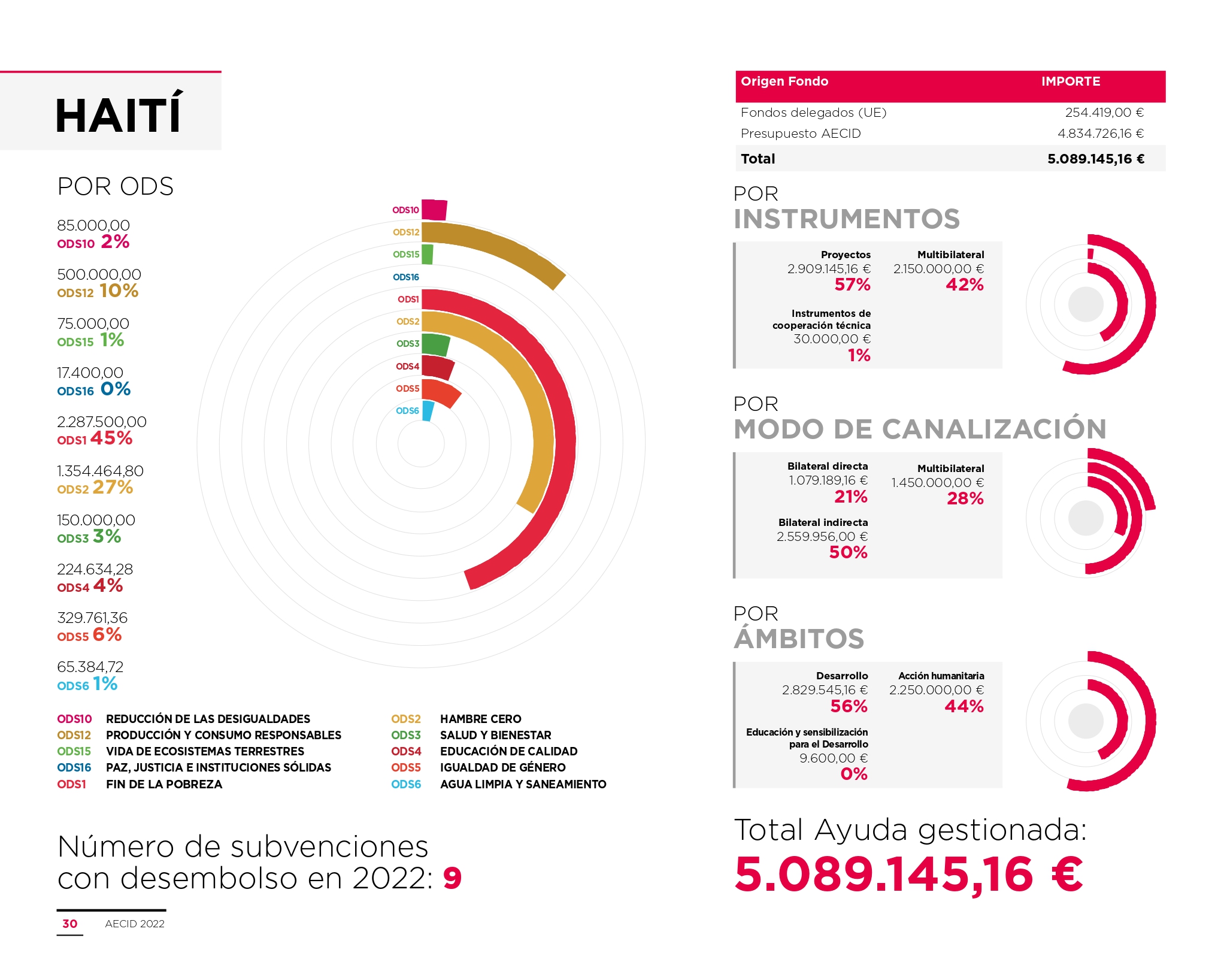 En 2022, Haití pasó a formar parte de la Estrategia de Acción Humanitaria española para América Latina y Caribe con un incremento notable de fondos humanitarios españoles; un total de 2.250.000 euros. Así, desde 2021 y hasta abril de 2023, la AECID había desembolsado un total de 5.288.000€ destinados a iniciativas de acción humanitaria en Haití.